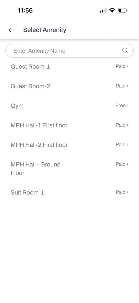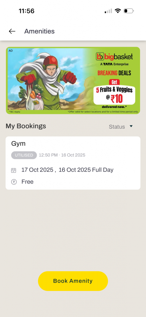 1. Go to the Community tab on the Mygate app and click on Amenities. You can view your previous bookings here